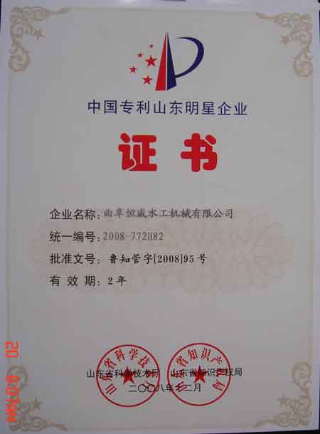 热烈祝贺曲阜恒威水工被评为二星级中国专利山东明星企