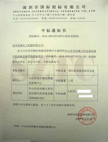 热烈祝贺公司中“中山市阜沙镇大有东泵站清污机设备安装采购招标项目”标